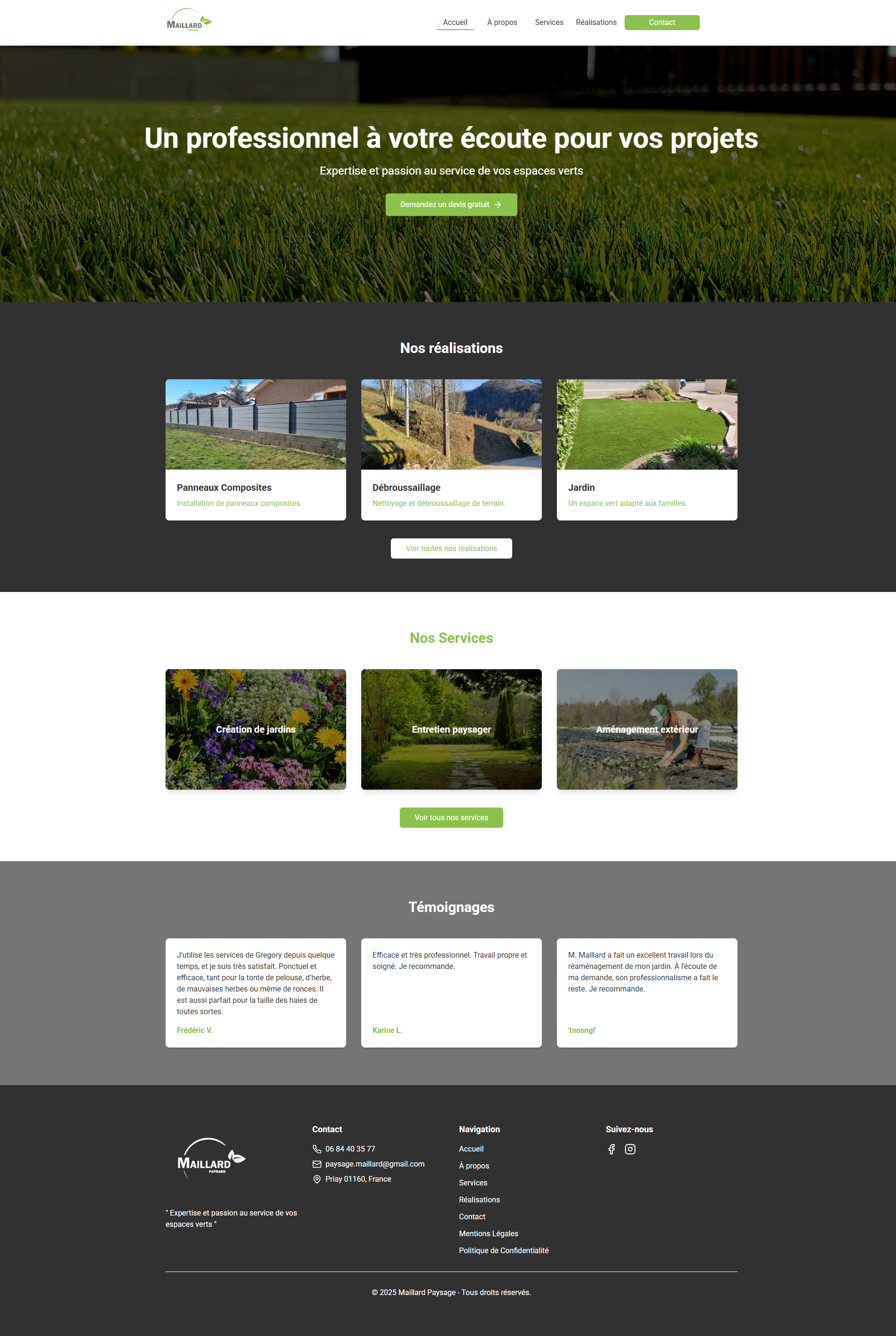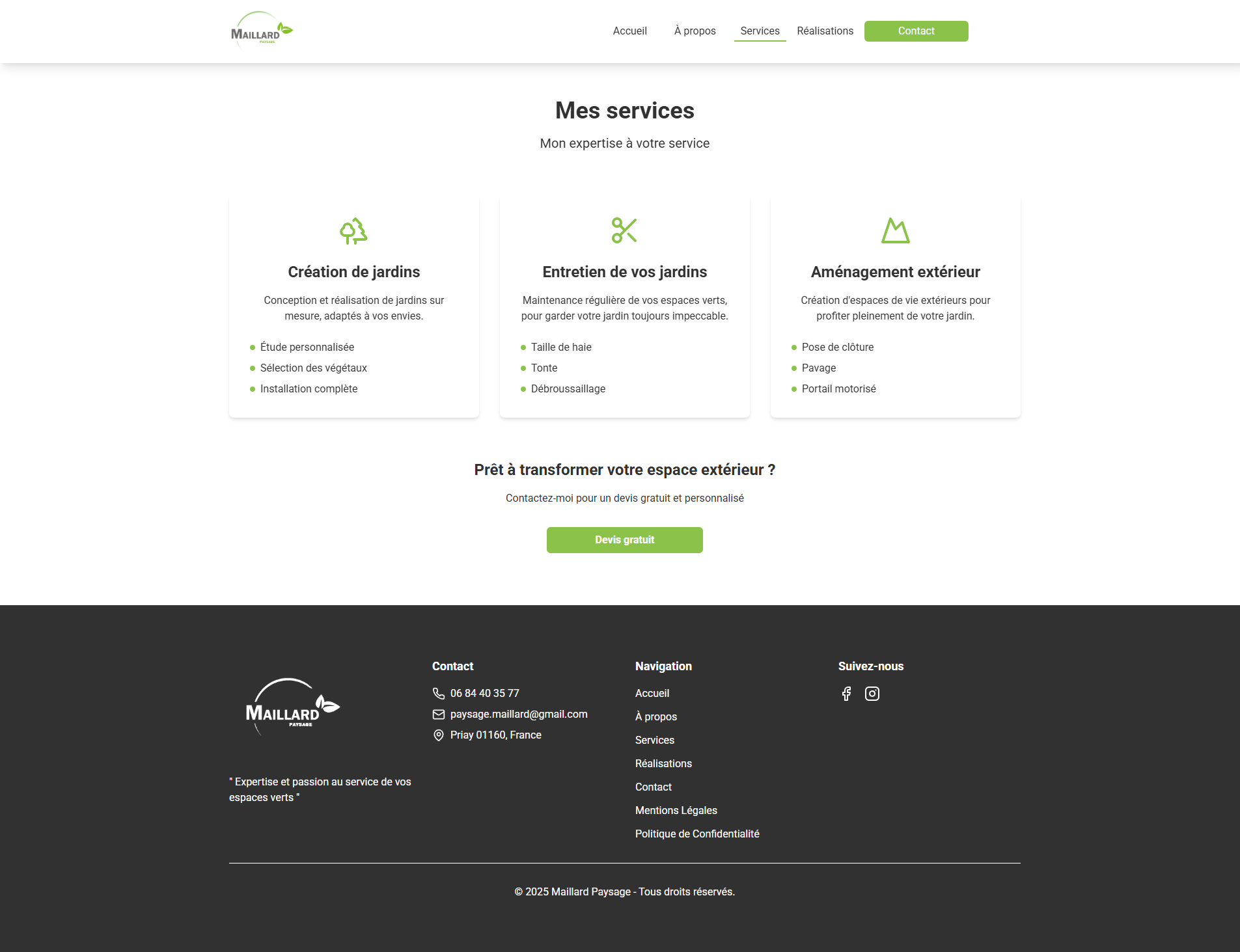 - 7 pages : Accueil, À propos, Services, Réalisations, Contact, Mentions légales, Politique de confidentialité